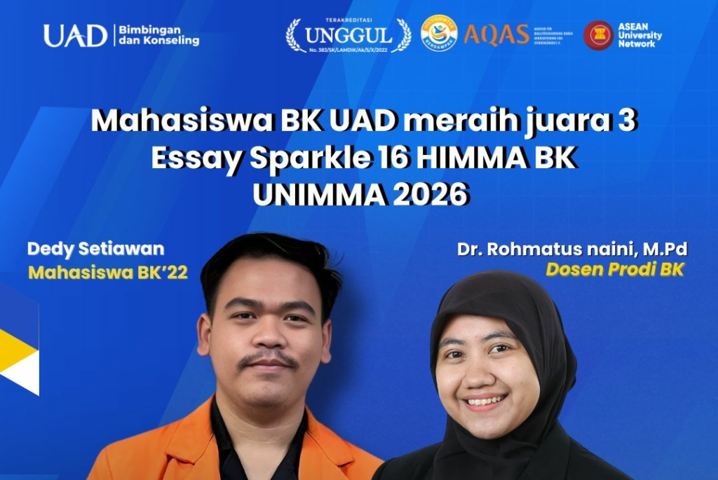 Kabar membanggakan datang dari Program Studi Bimbingan dan Konseling Fakultas Keguruan dan Ilmu Pendidikan Universitas Ahmad Dahlan. Salah satu mahasiswanya, Dedy Setiawan, berhasil meraih Juara 3 dalam ajang Essay Sparkle 16 yang diselenggarakan oleh HIMMA BK UNIMMA pada tahun 2026.
